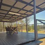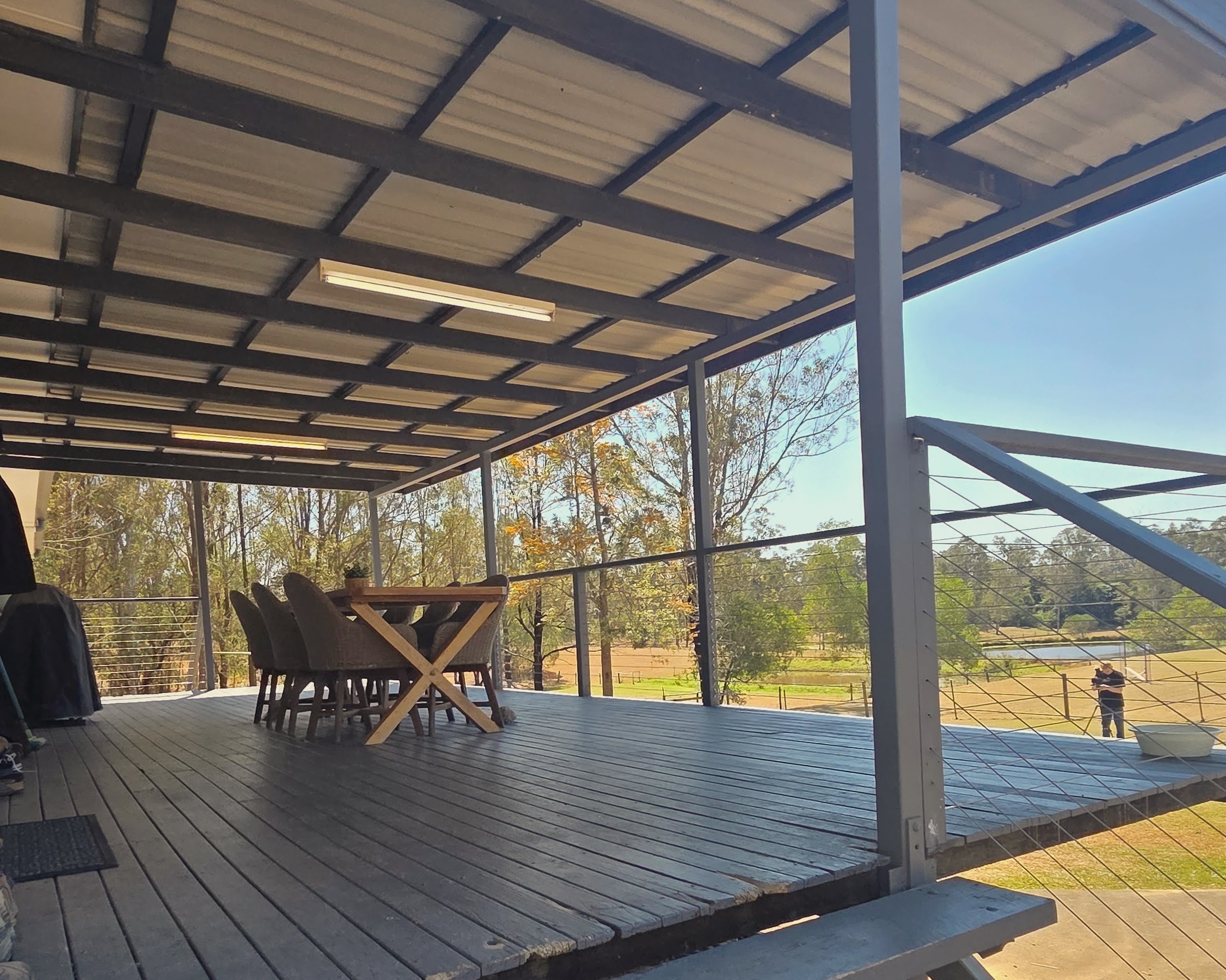 Modern outdoor entertaining with fire pit & landscaped spaces overlooking lush paddocks