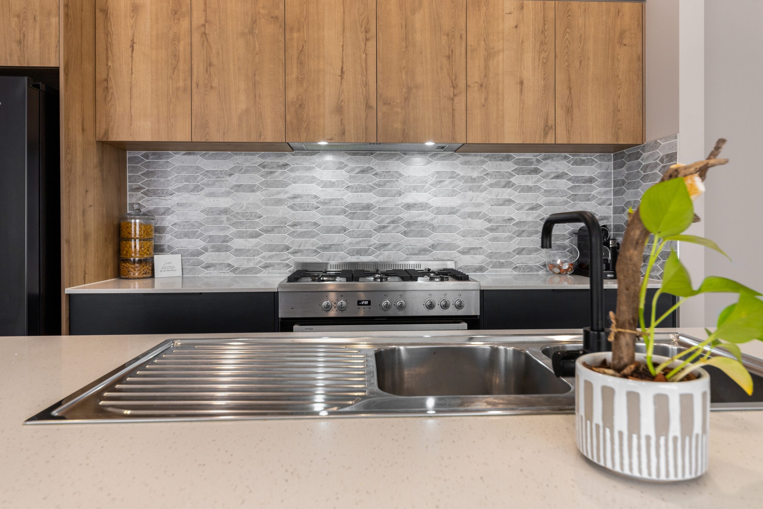 – Modern kitchen with stunning stone benchtops, 4 generous pot drawers, and a 900mm free-standing gas cooktop, making life easy.