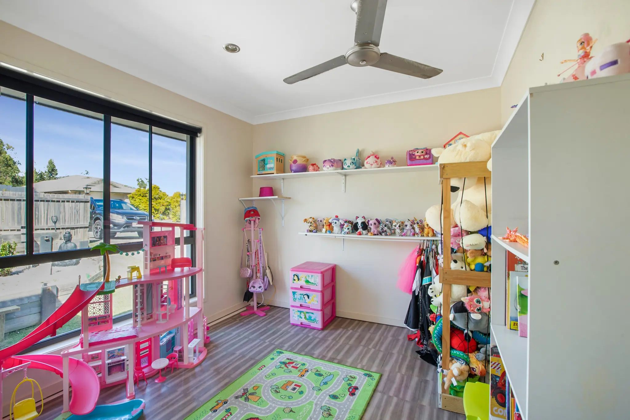 – Covered alfresco + built-in trampoline & play area