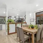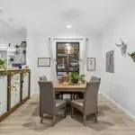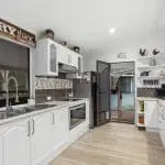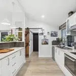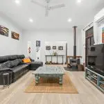 The renovated kitchen boasts stone benchtops, a 900mm oven, walk-in pantry, and serving bar, flowing effortlessly to the dining and living areas, warmed by a cosy wood heater.