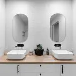 – Main bathroom featuring walk-in shower, wall-mounted vanity, and modern fixtures.