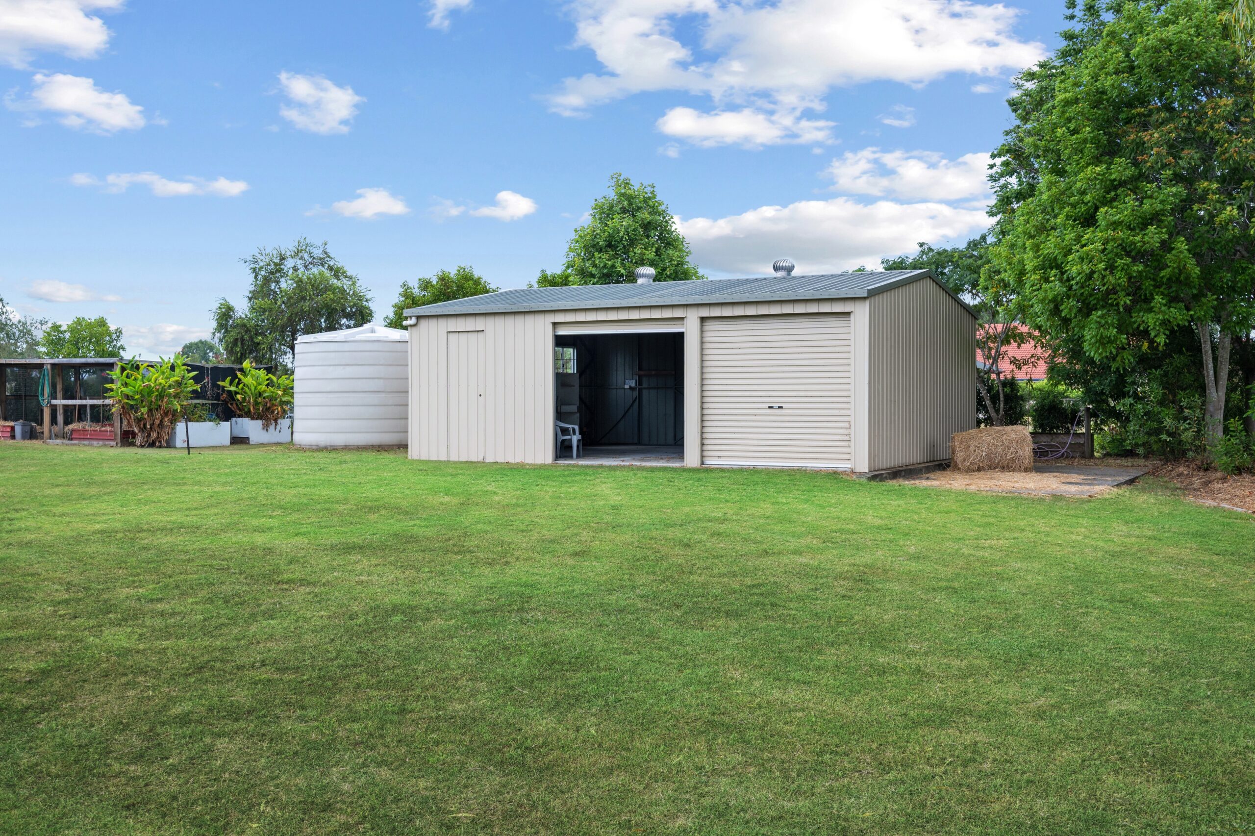 – 7m x 9m shed with side access and concrete pad for additional vehicles or caravans.
