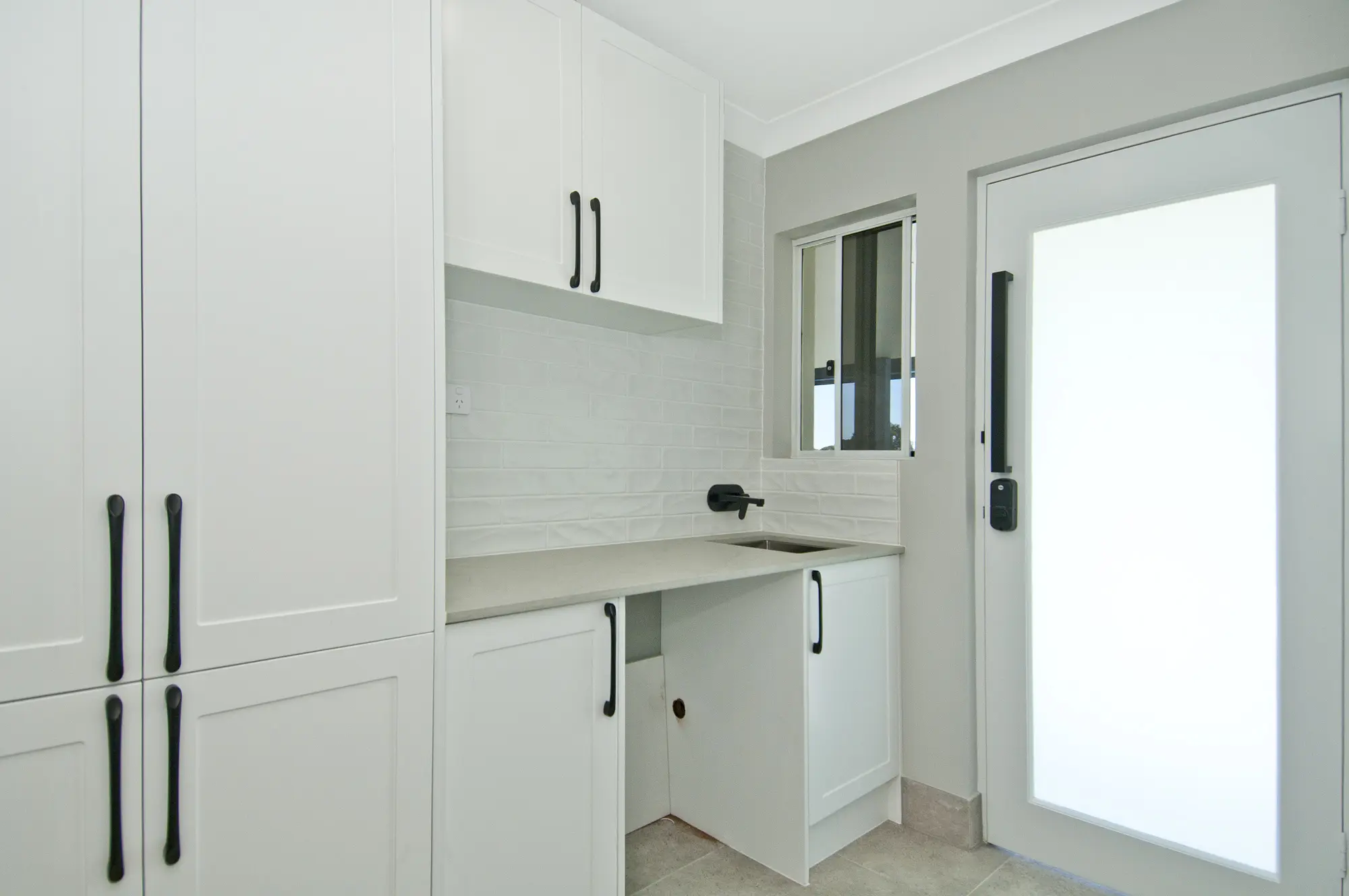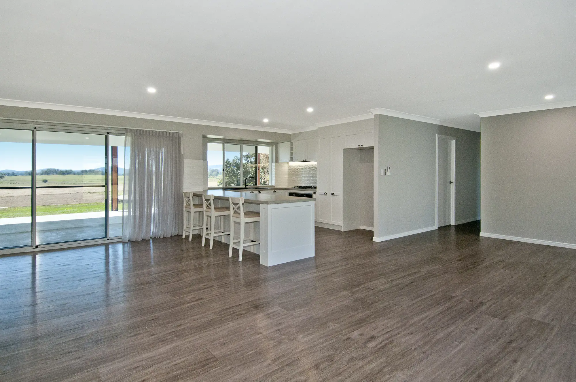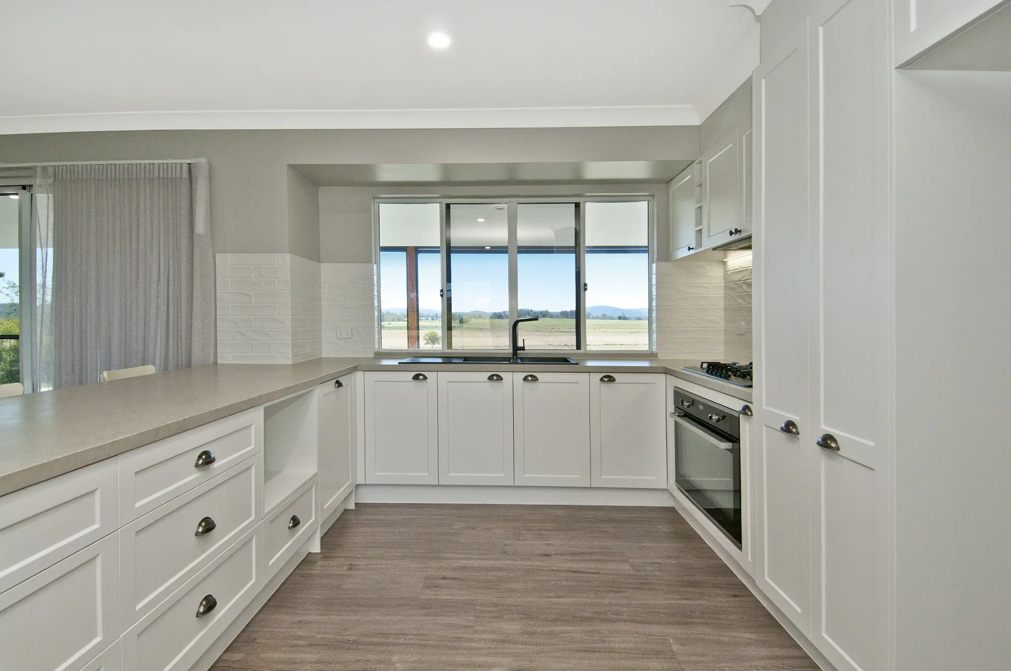 A modern Country-Hamptons style white shaker kitchen with stone bench tops, featuring a integrated dishwasher, plumbed water for fridge (area large enough for modern fridges), electric appliances and room for tea and coffee station overlooking the back paddocks through the white framed window.