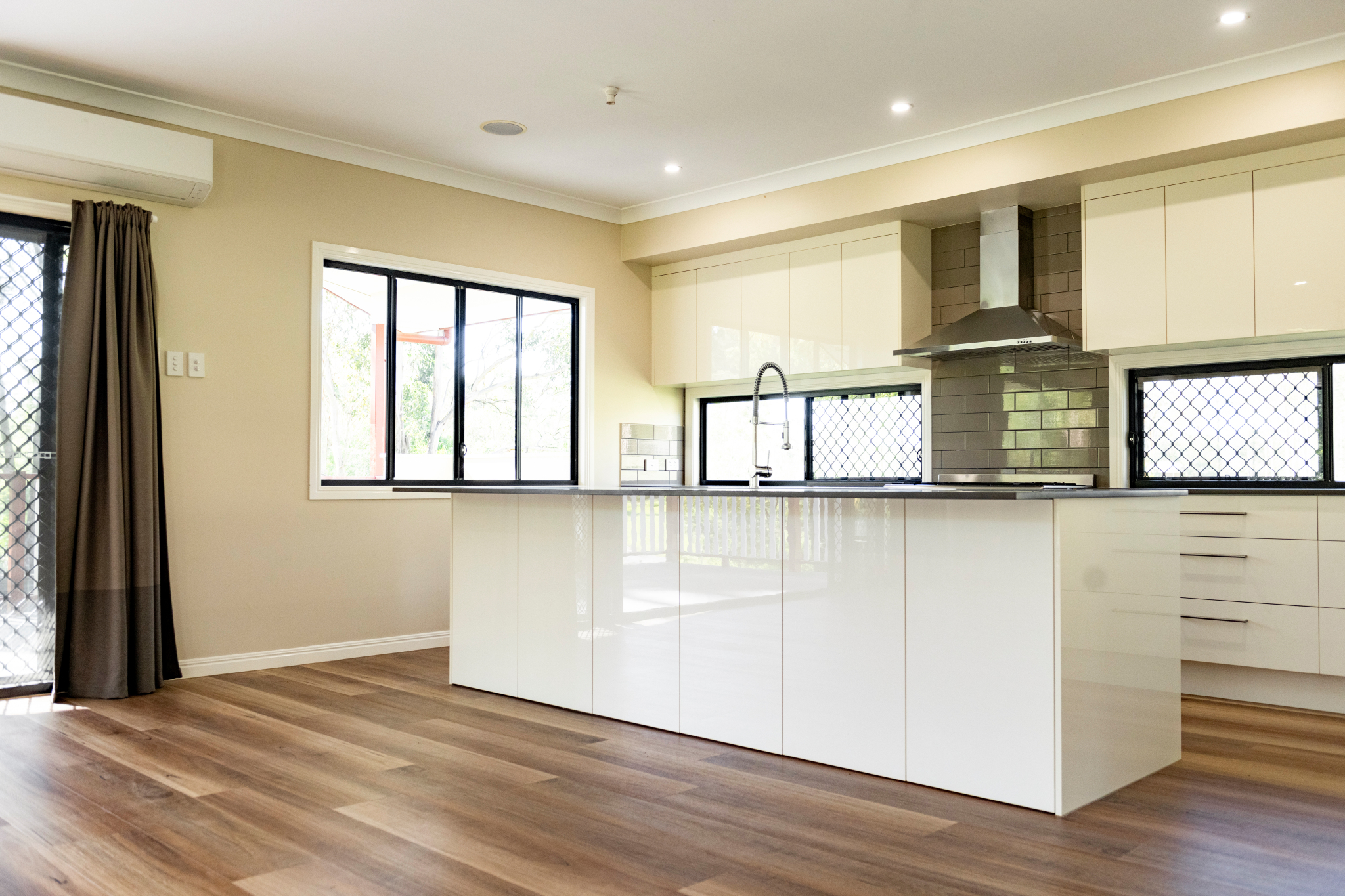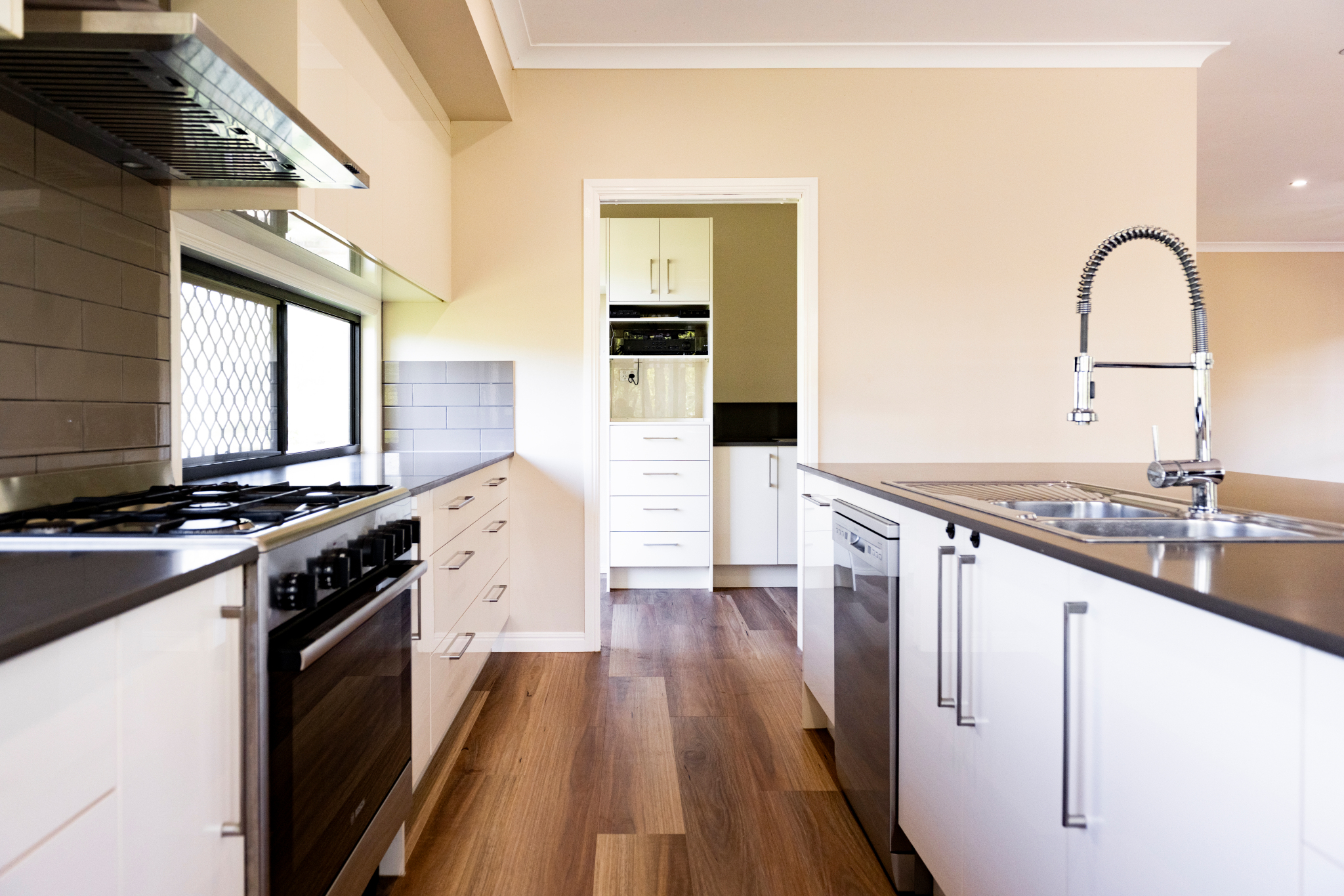 • Well‑appointed kitchen with gas cooktop, oven, dishwasher, island bench & walk‑in pantry
