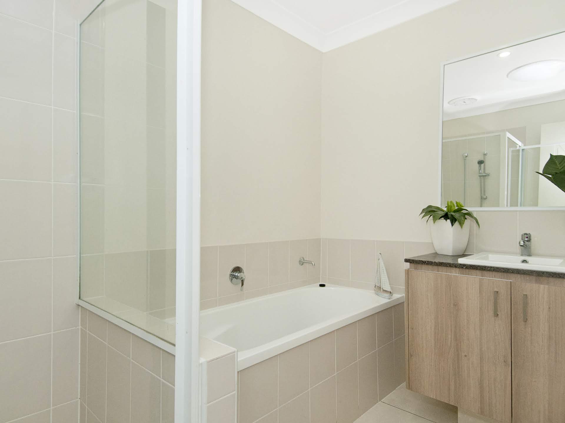 The family bathroom features a large bath and separate shower and is central to the internal laundry.