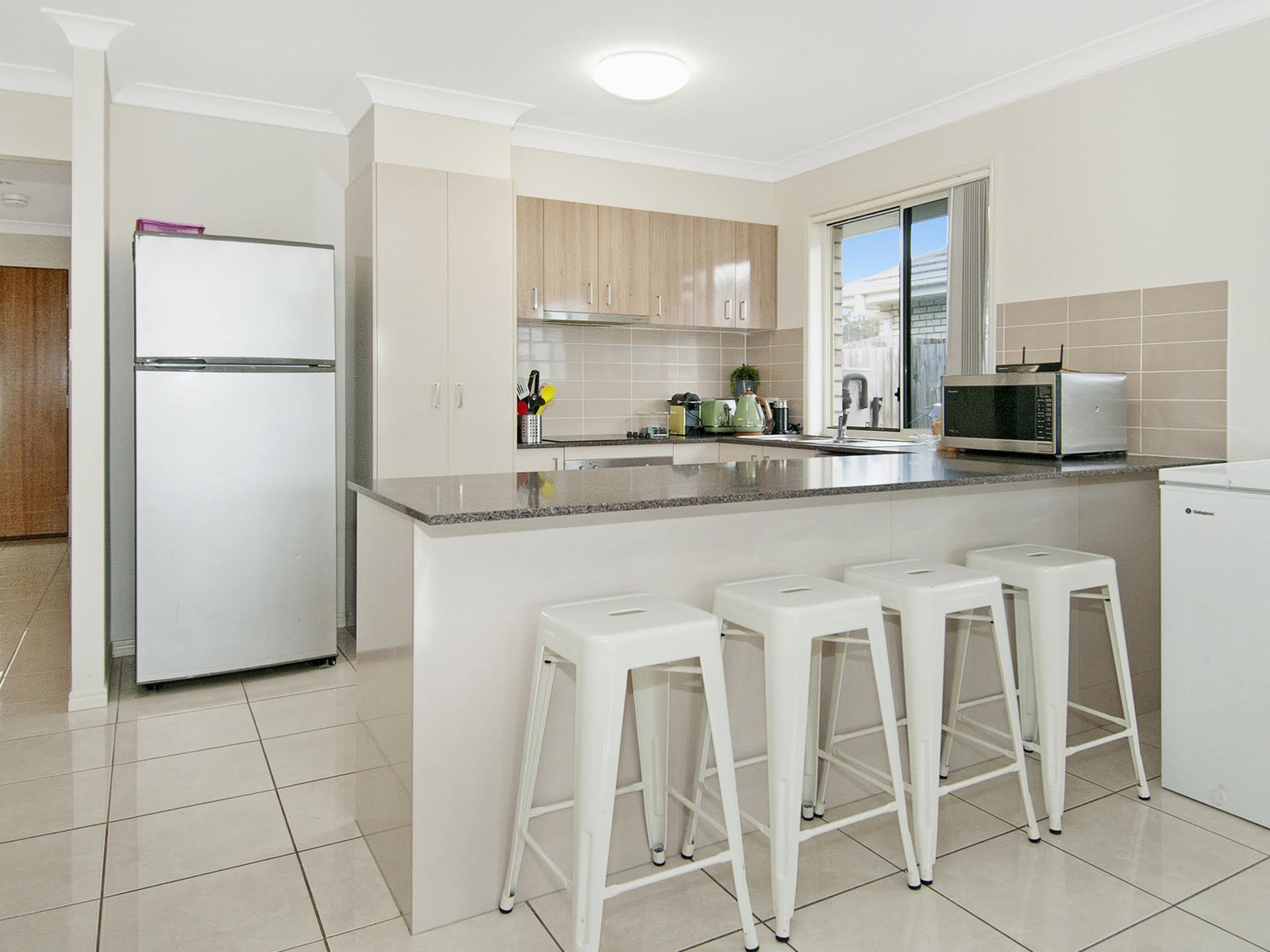 Inside you are greeted with a well appointed kitchen fitted with quality stainless steel appliances, great storage bench space suitable to use as a breakfast bar for those busy mornings.