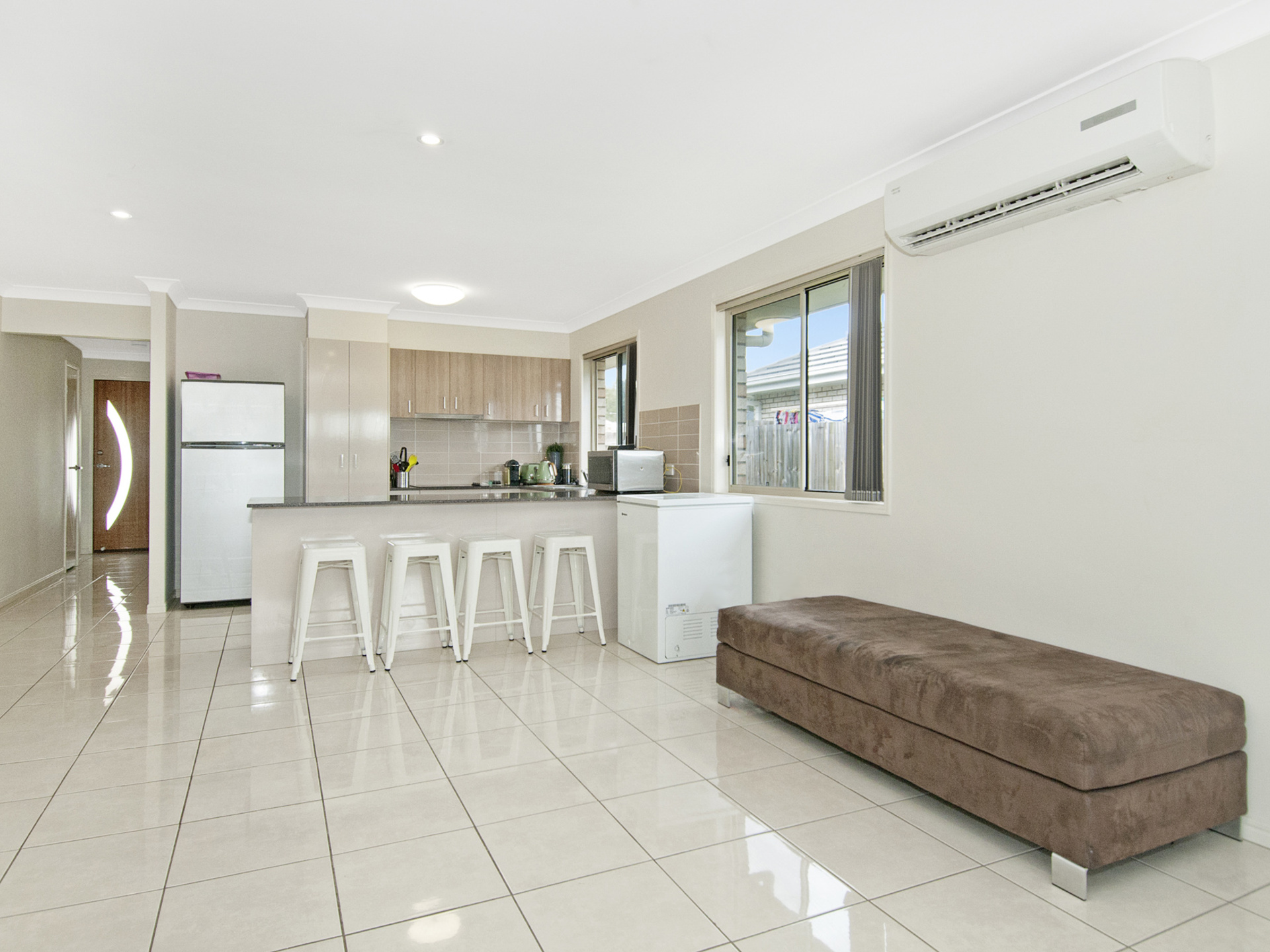 The kitchen overlooks the air conditioned, tiled, open plan lounge and dining areas with large glass door and windows overlooking the back yard.