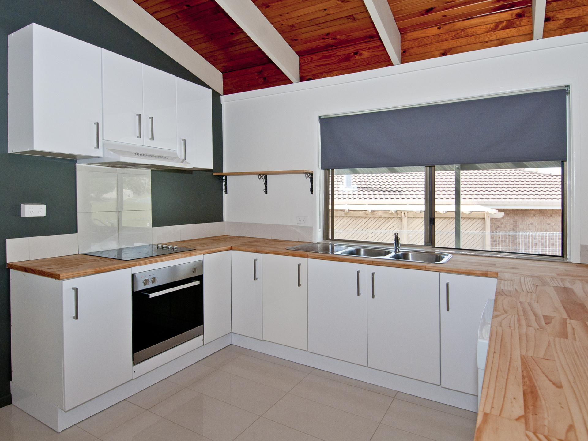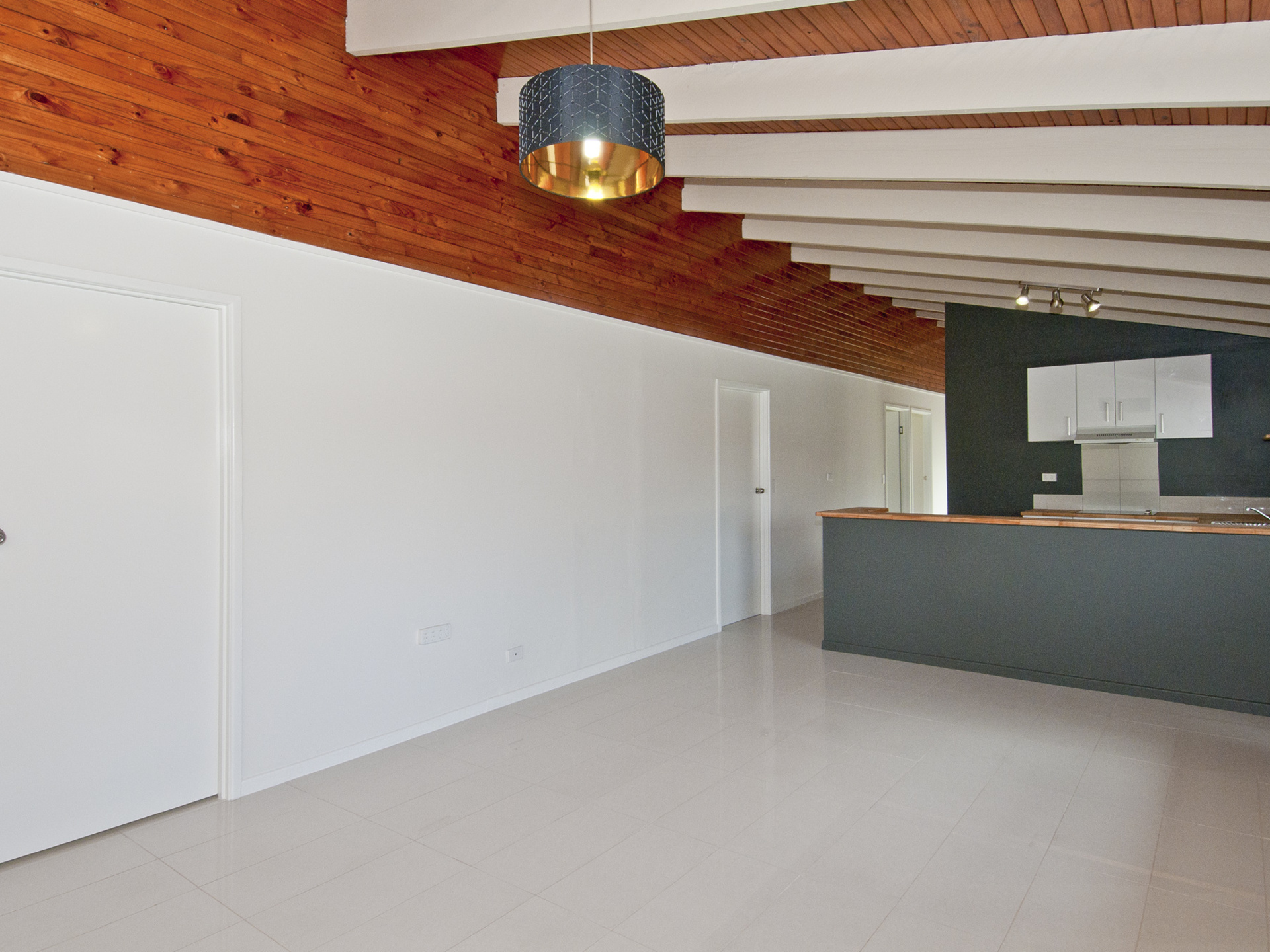 The open plan living and dining area feature raked ceilings providing ample light and air flow. The kitchen opens to the dining area and is neat and modern with an electric cook top and stove, exhaust fan and dishwasher.