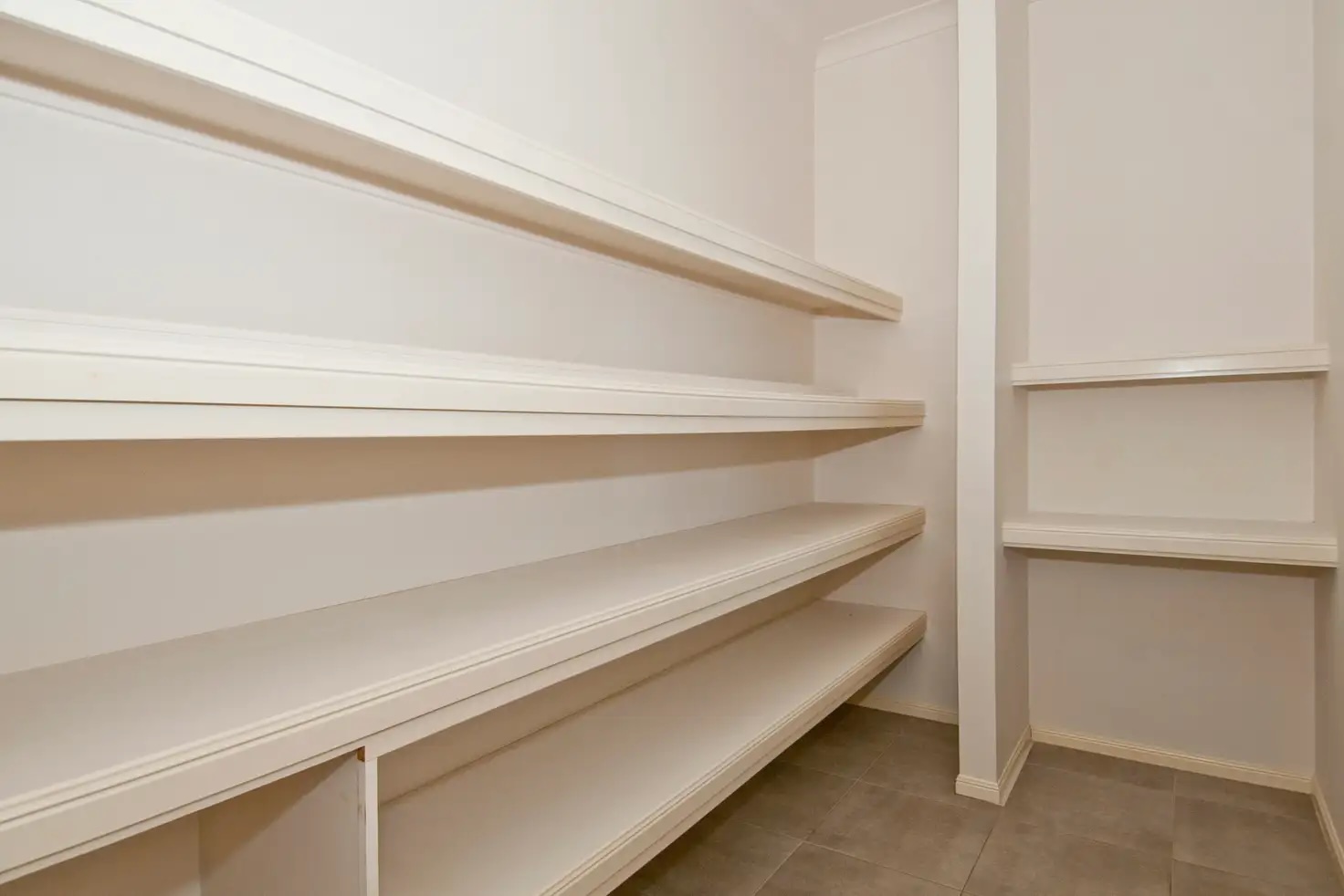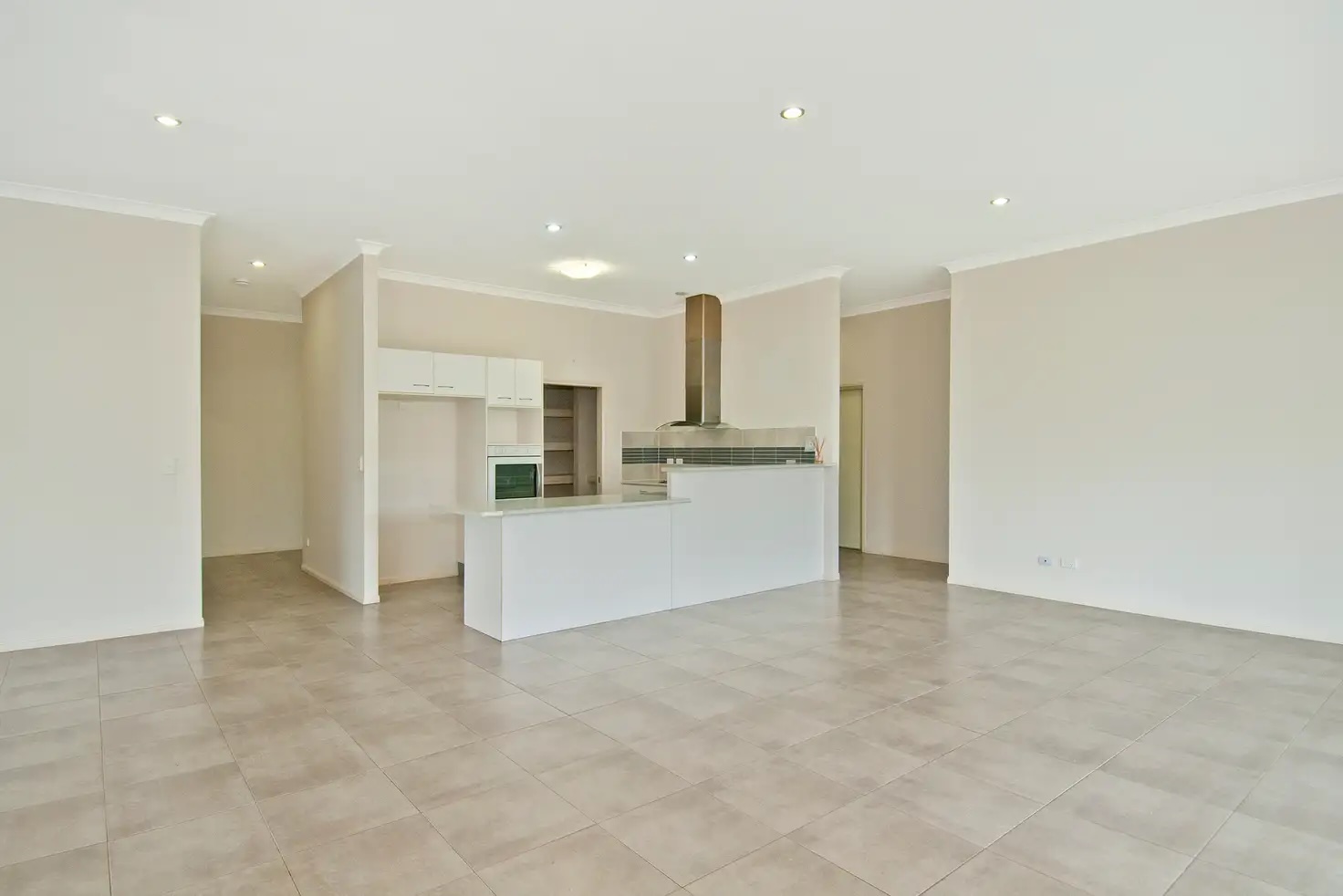 A modern white kitchen with quality appliances including gas cooktop, dishwasher also features a HUGE walk in pantry with room for a fridge freezer,