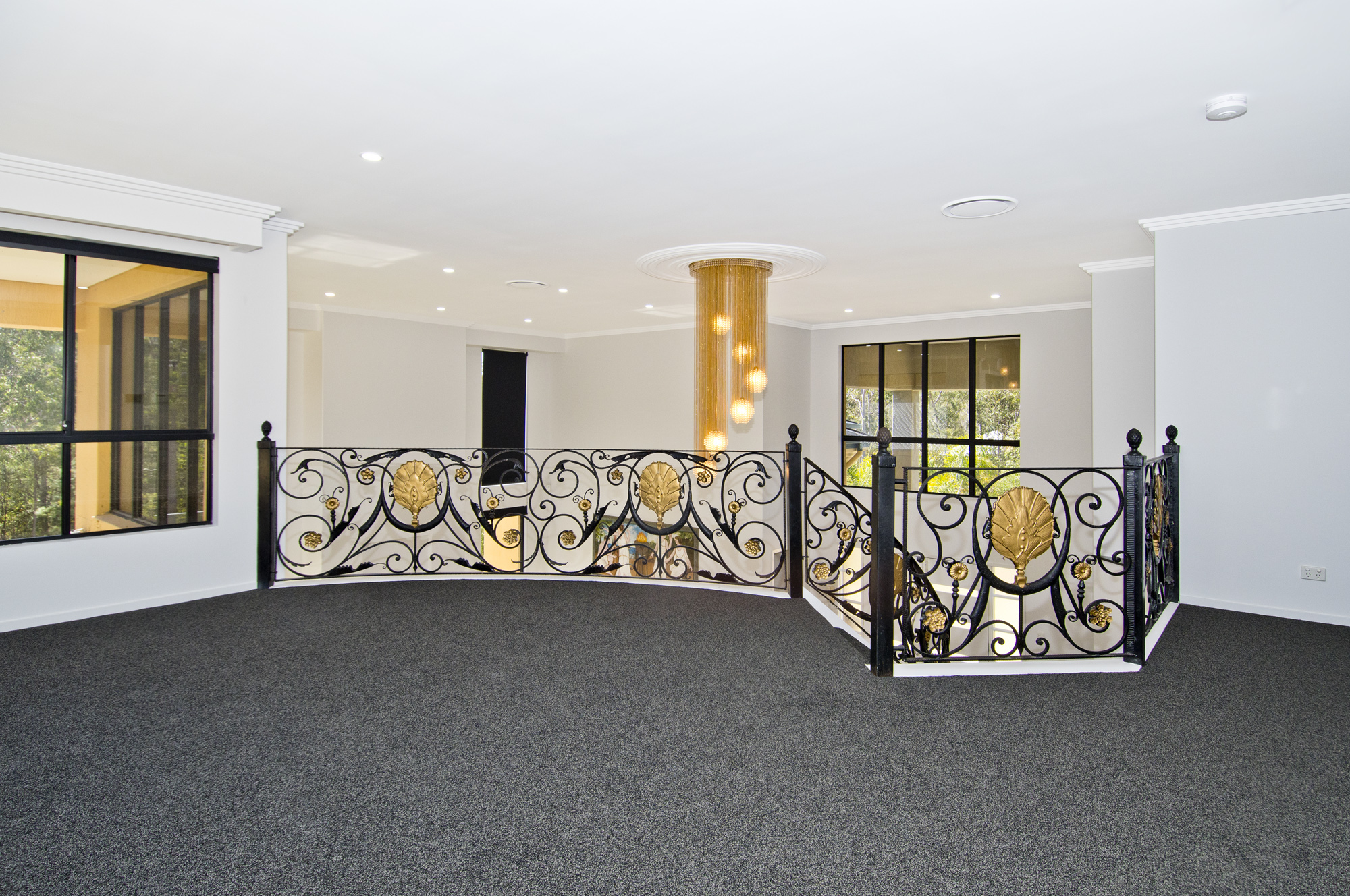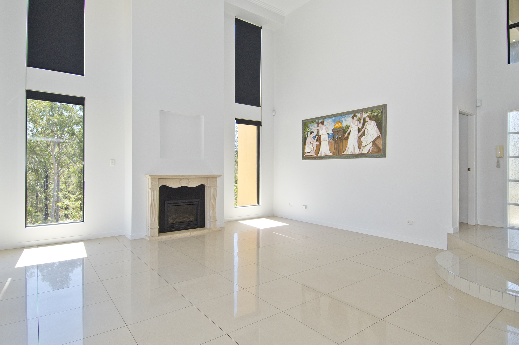 This architectural marvel is laden with premium features, merging contemporary design with Roman Palace elements. Think double-story cathedral ceilings, sleek cornices, a marble electric fireplace, and high-quality white tiles that reflect abundant natural light. The detail and quality of this home are simply second to none.