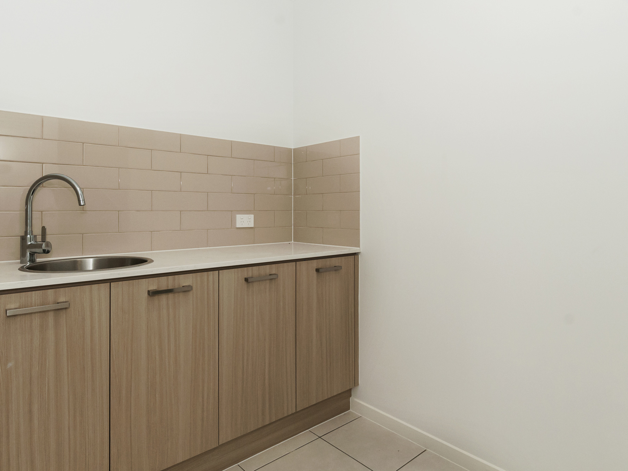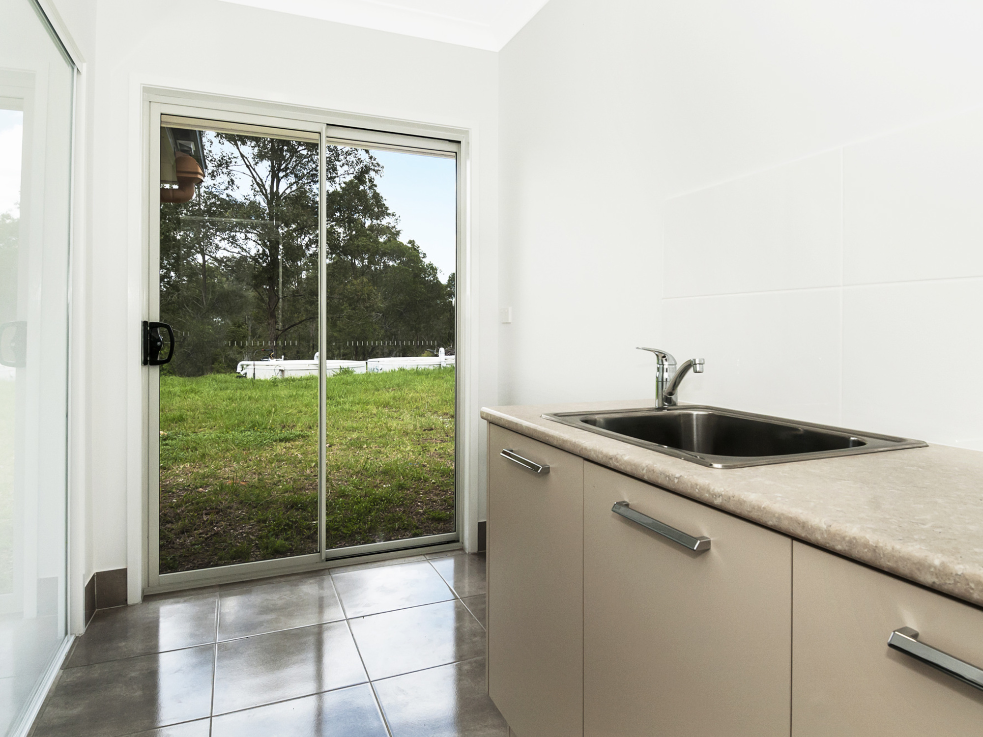 The envious butlers pantry features stone bench top, sink, cupboard and open shelving.