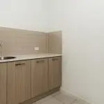 The envious butlers pantry features stone bench top, sink, cupboard and open shelving.