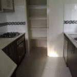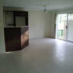 Kitchen, dining area and lounge all situated together with tile floors throughout.
