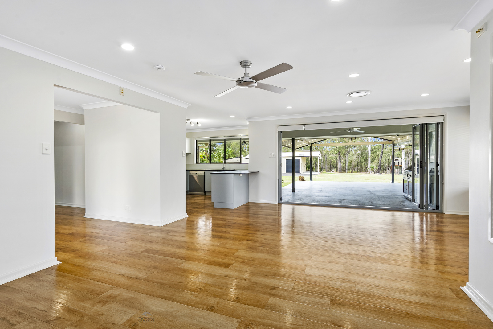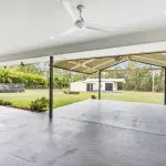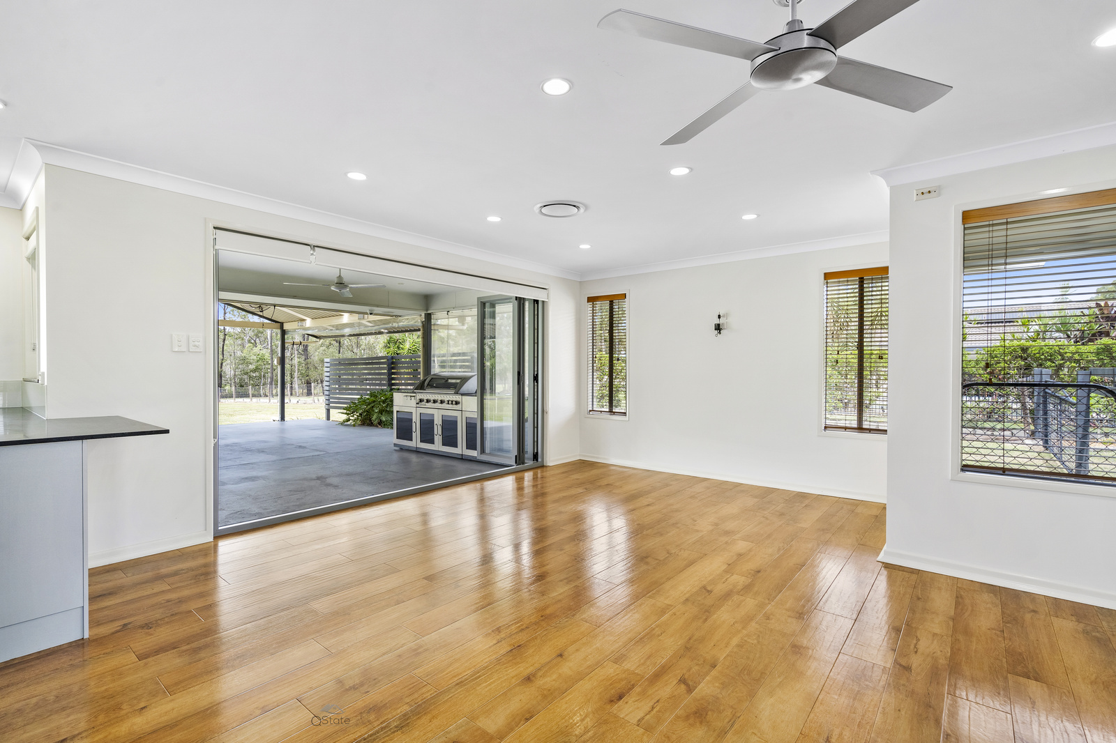 This kitchen overlooks the back yard and the ultimate patio alfresco which features full bi-fold opening doors from the open plan living and dining; Fully plumbed Matador BBQ with stone bench top, wok burner & warmer tray, cafe blinds and ceiling fan.