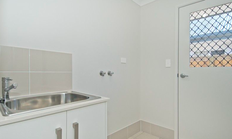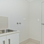 Functional laundry with linen cupboard, tub, and additional under-bench storage