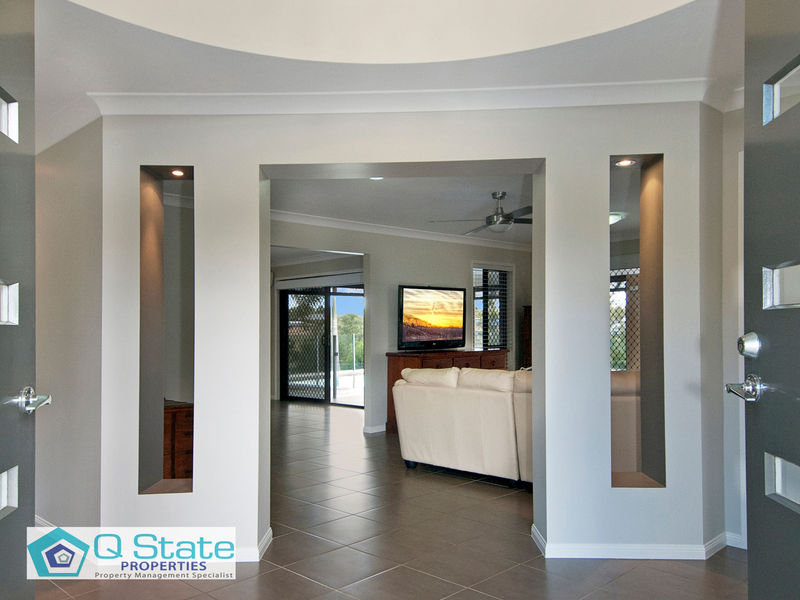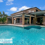 Stepping inside the home through the large double timber entry doors the glass pendant chandelier shines within the 2 storey entrance way and views through to the breathtaking pool.